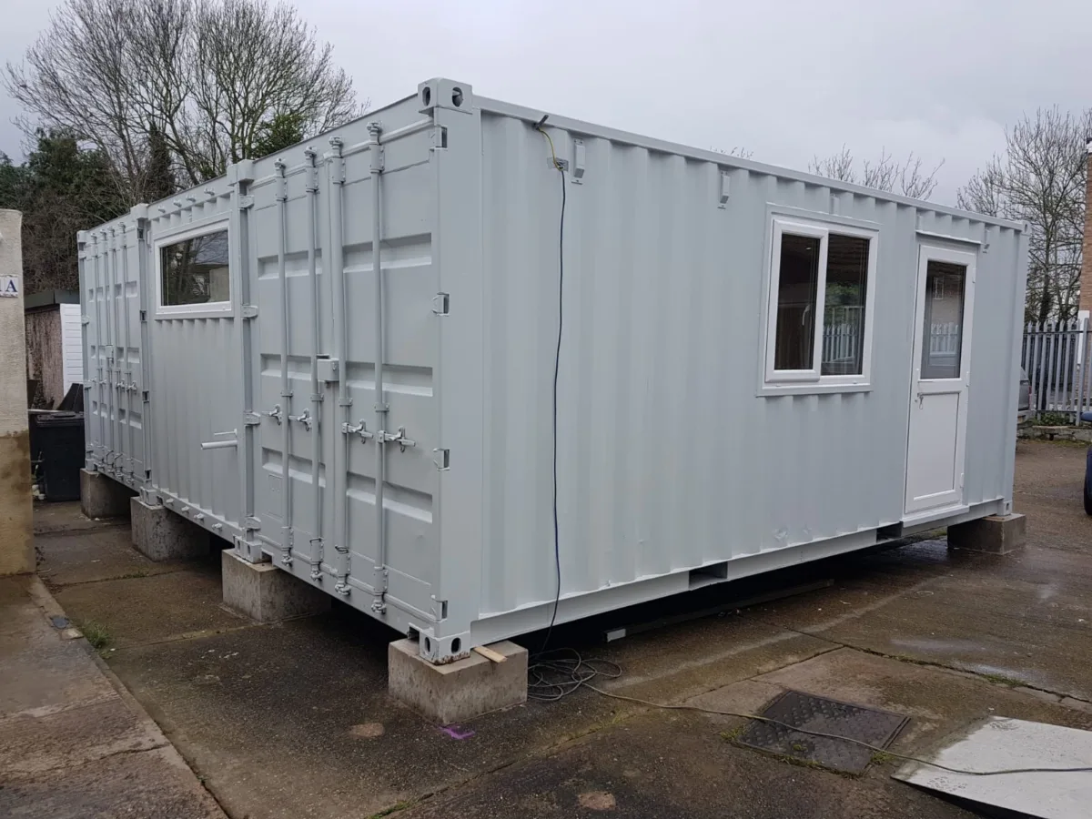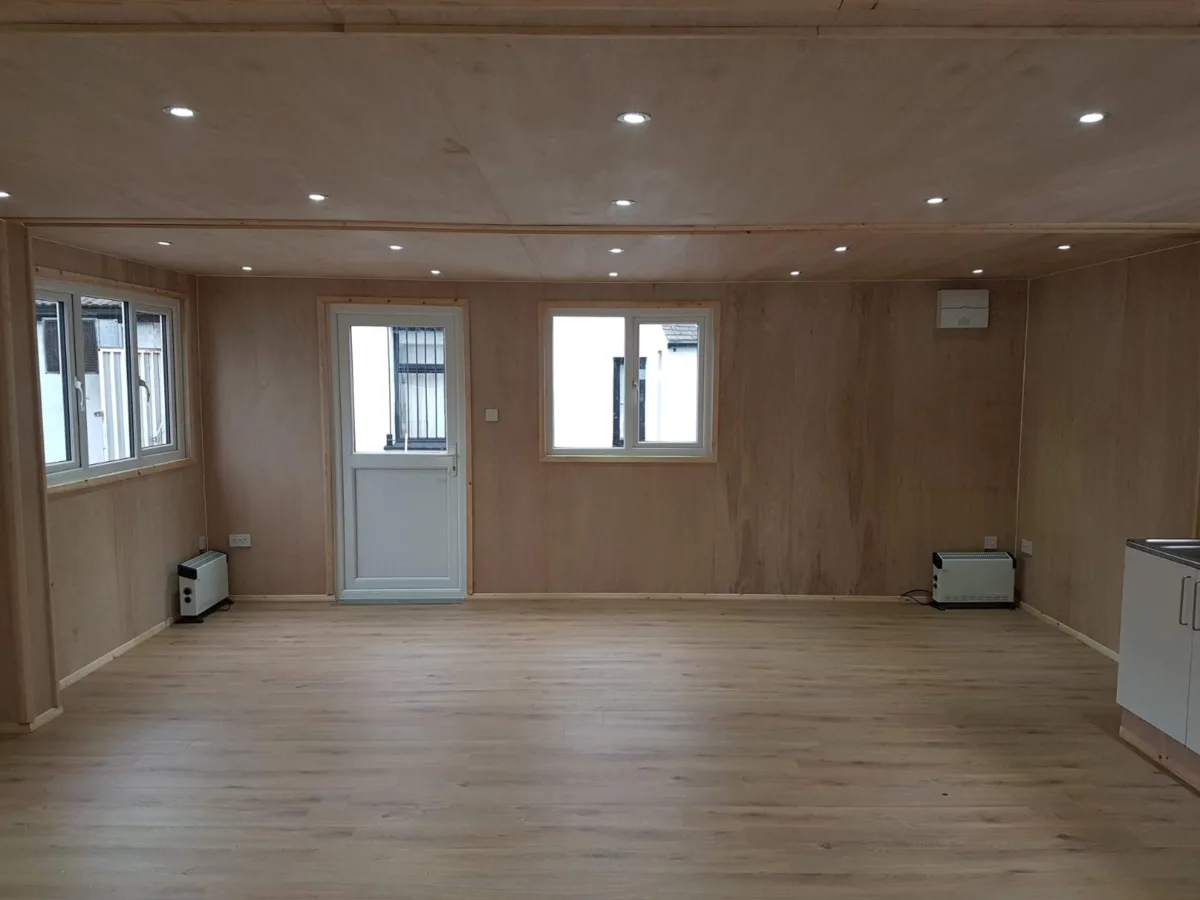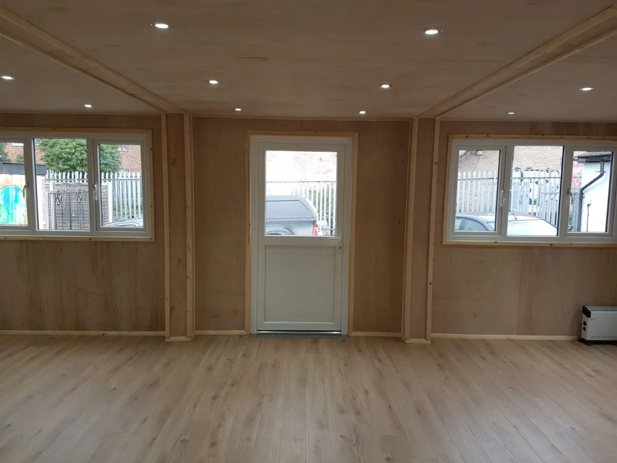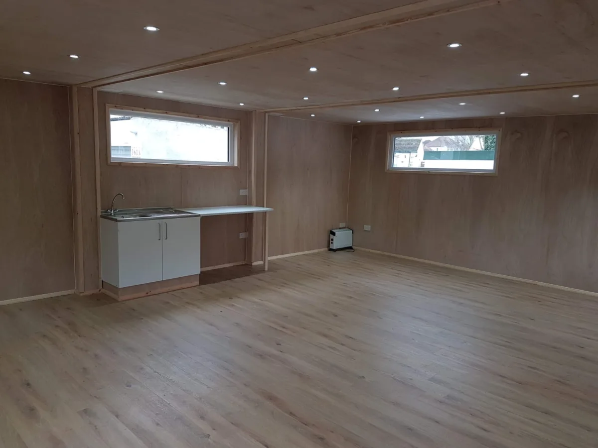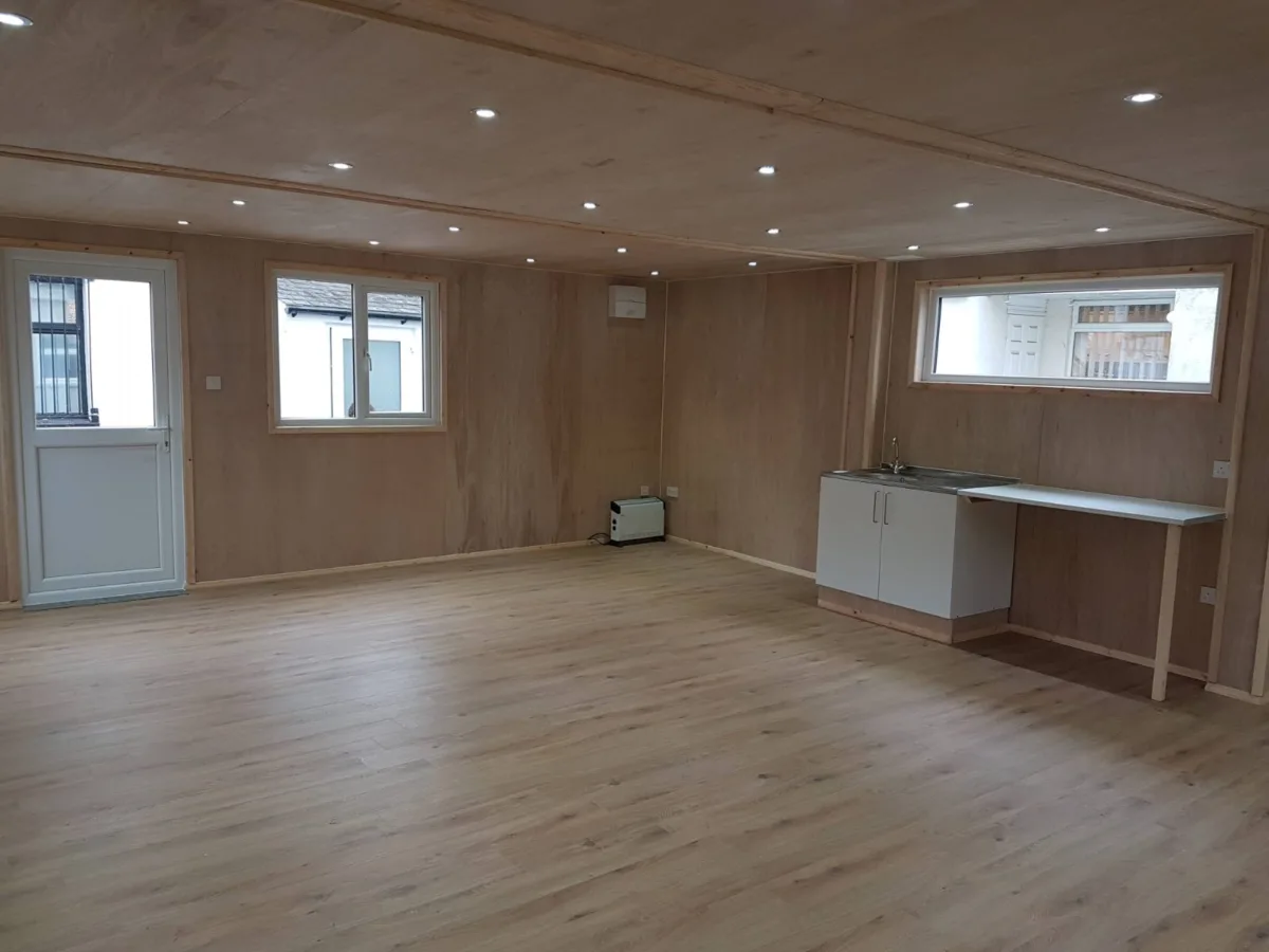 To enhance the workspace, we added large windows and personnel doors, along with full insulation, ply lining, lighting, plumbing for a working sink, and quality flooring. These thoughtful additions allow natural light to flood the interior and ensure building regulation–compliant access. The result is a bright, comfortable, and efficient office environment.